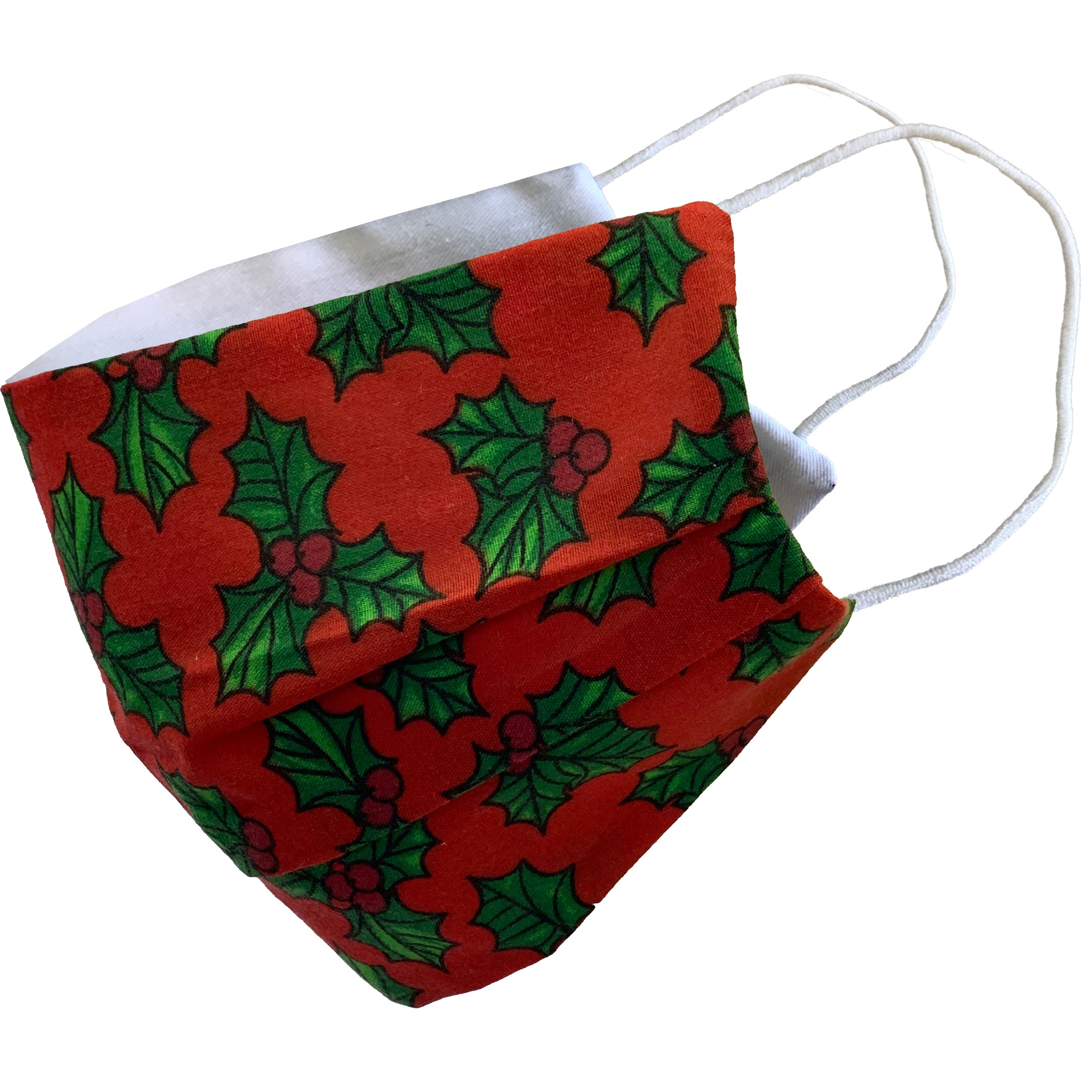 Christmas Print Bold Red Holly Face Mask with Green Holly Leaves. Made from high quality Cotton fabric for the outer face, with an inner face of white cotton. Direct from UK manufacturer. The Mask is 8.5 inches wide and 3.5 inches tall (expanding to 6 inches tall) and covers the nose and mouth. The soft Elasticated loops hook around the ears for a comfortable fit.