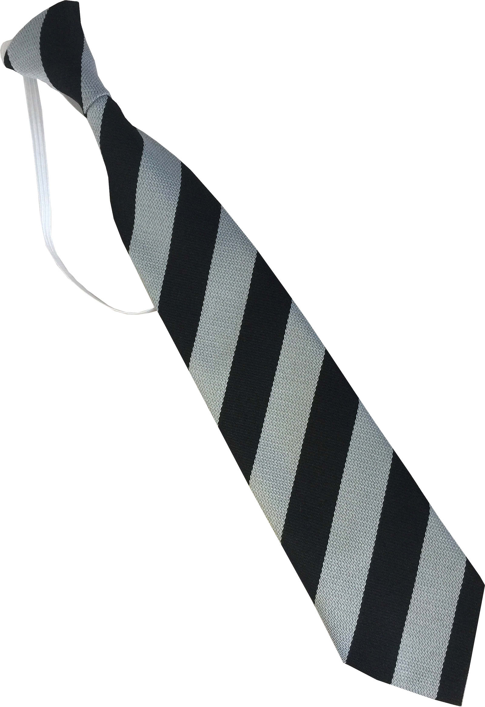 11 inches long, with generous elastic neckband. Just tie a knot in the elastic at the back of the neck to fit, then tuck it under the back of the collar.