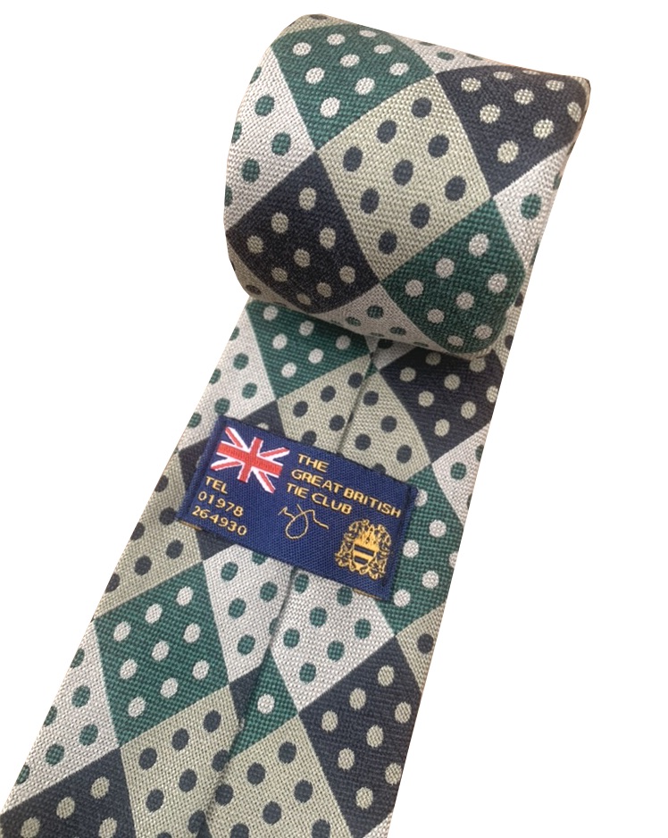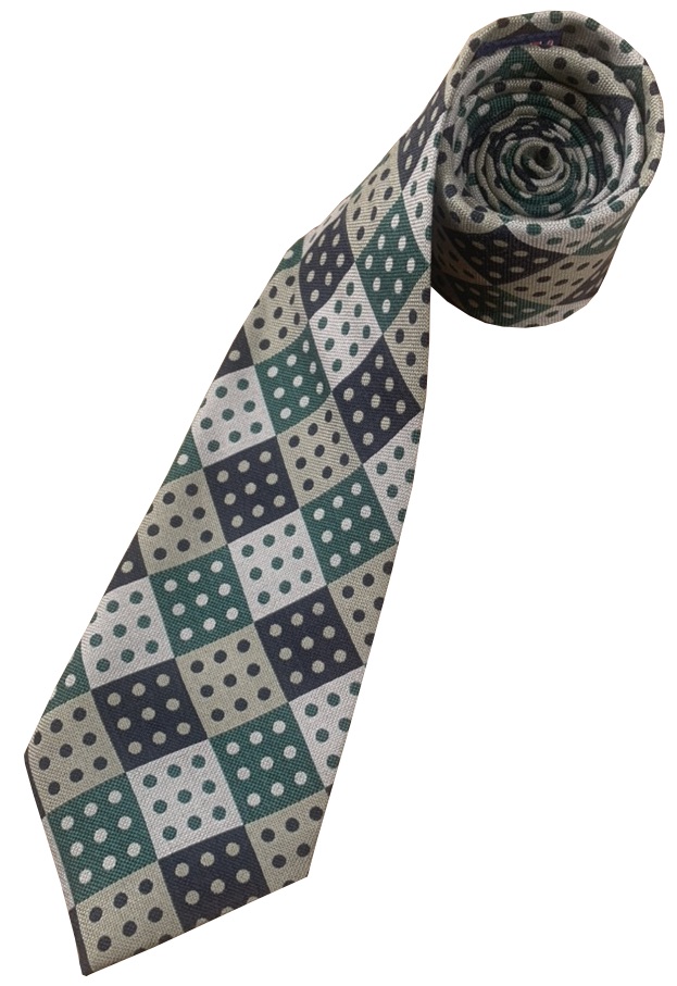 Domino Check Men’s tie with 9 Spots Green Navy Blue and Tan made in the UK from woven Silk fabric. Direct from UK manufacturer.