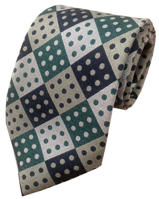 Domino Check Men’s tie with 9 Spots Green Navy Blue and Tan made in the UK from woven Silk fabric. Direct from UK manufacturer. The Ties Measure 57 inches long and are 3.25 inches across at the widest point.