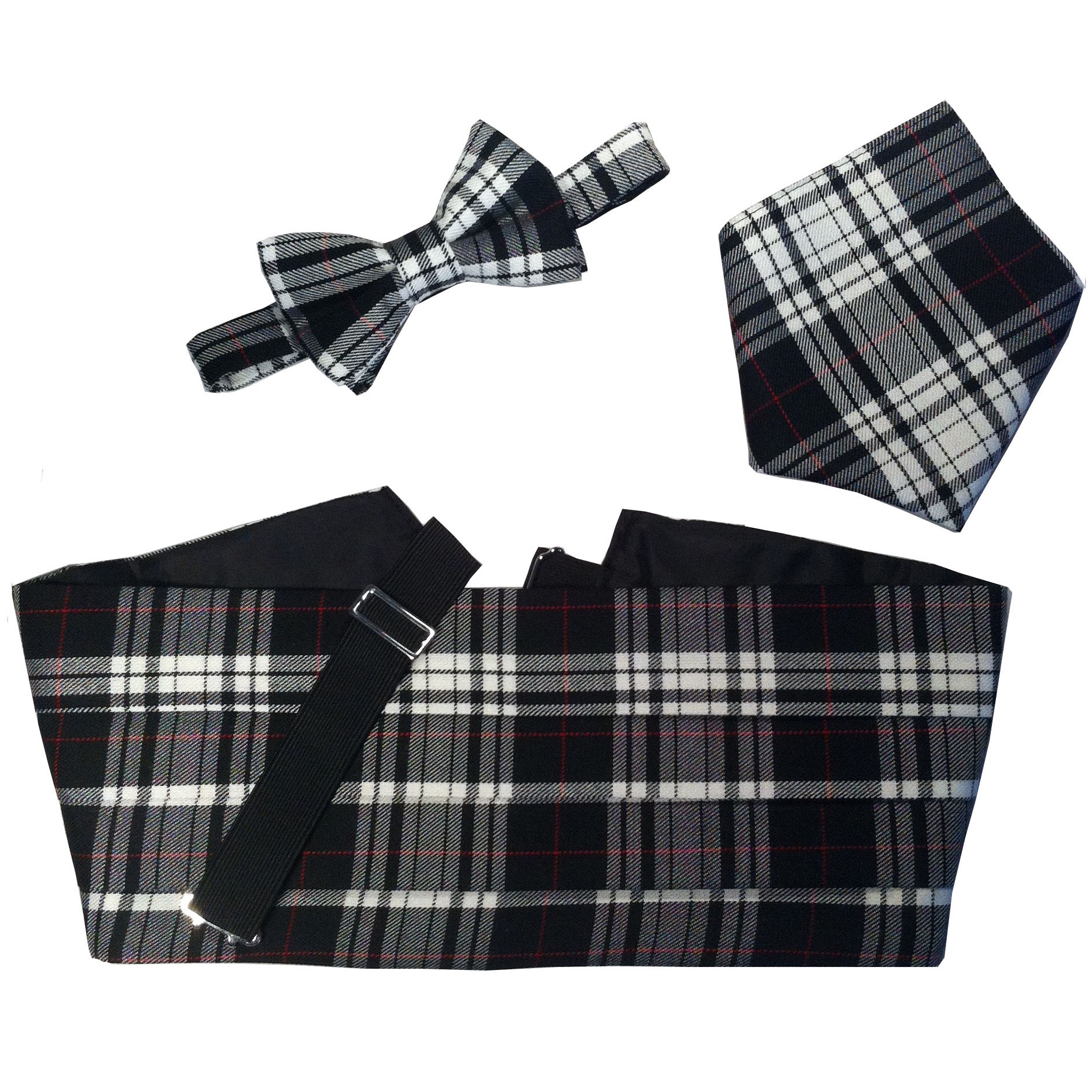 Dress Menzies Tartan Cummerbund and Bow Tie Set including Pocket Square Set made in the UK from Tartan woven Polyviscose fabric. Direct from UK manufacturer. The Cummerbund measures 25 inches wide and 5.5 inches tall. Its elasticated waistband accommodates waists from 32 inches up to 42 inches.