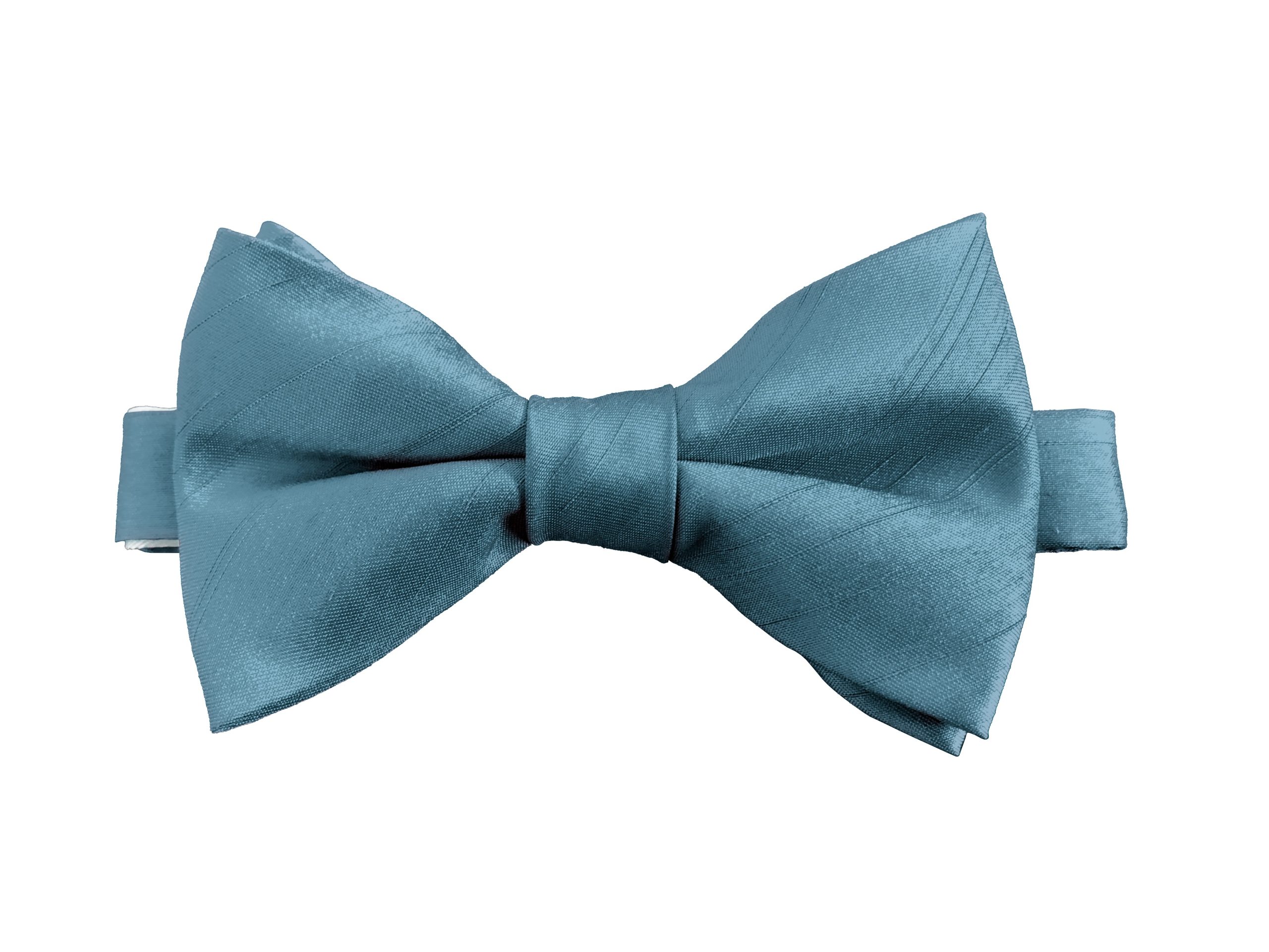 Teal Ready Tied Bow Tie made in the UK from High quality cloth produced with a Dupioni faux slub woven Polyester fabric. Direct from UK manufacturer. The Bow measures 4.5 inches wide, and the Bow Wings are 2.5 inches tall. The adjustable neckband is suitable for collars up to 19 inches.