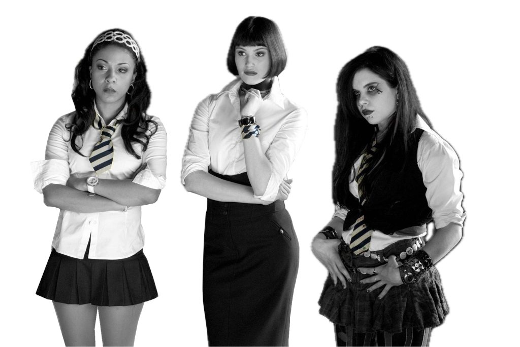 The St. Trinians School Tie is a standard school tie used by many schools across the UK. they have been seen in many of the films across the years from as early as the 1950s to the most recent production in 2007 and shows the tie in most as this Navy Blue and White (light silver). Though many of the early films were shown in Black and White, many of the colour productions show the Blue and white combination, reinforcing the tie shown in the 2007 movie.